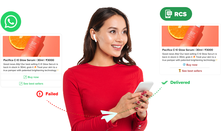 Don’t lose customers to failed WhatsApp messages. Automatically switch to RCS with Interakt, at just 25% of WhatsApp notification costs, with click rates nearly as high.