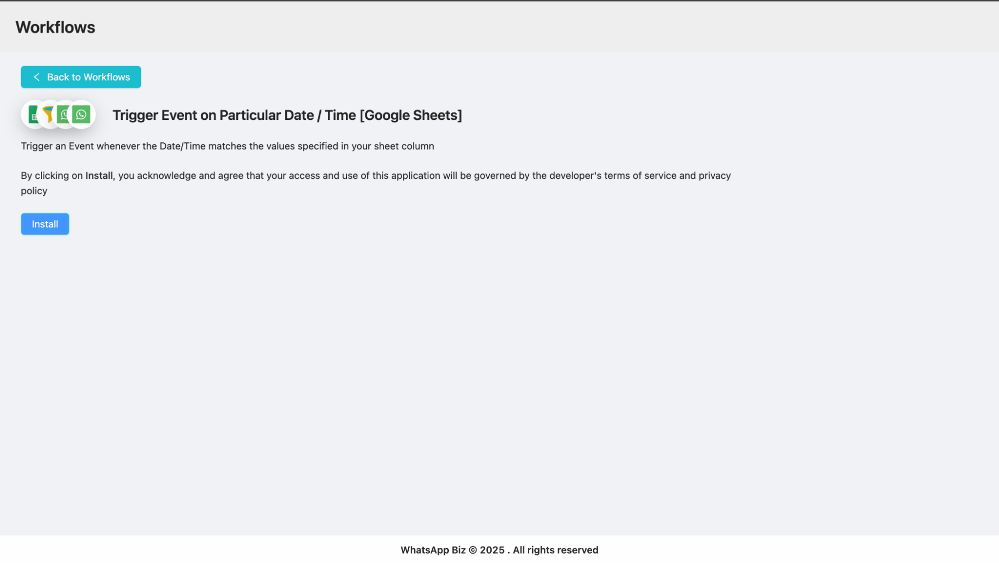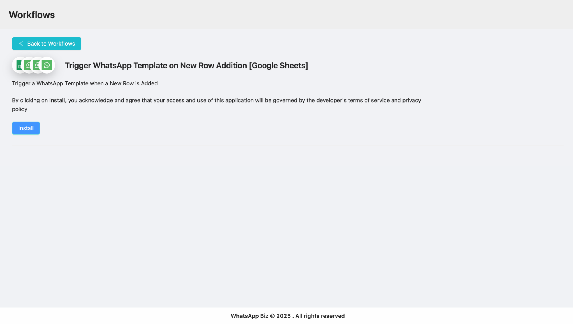 Click the Install button to install this particular workflow to your Interakt account. The installation process takes just a few seconds and prepares the workflow for configuration.