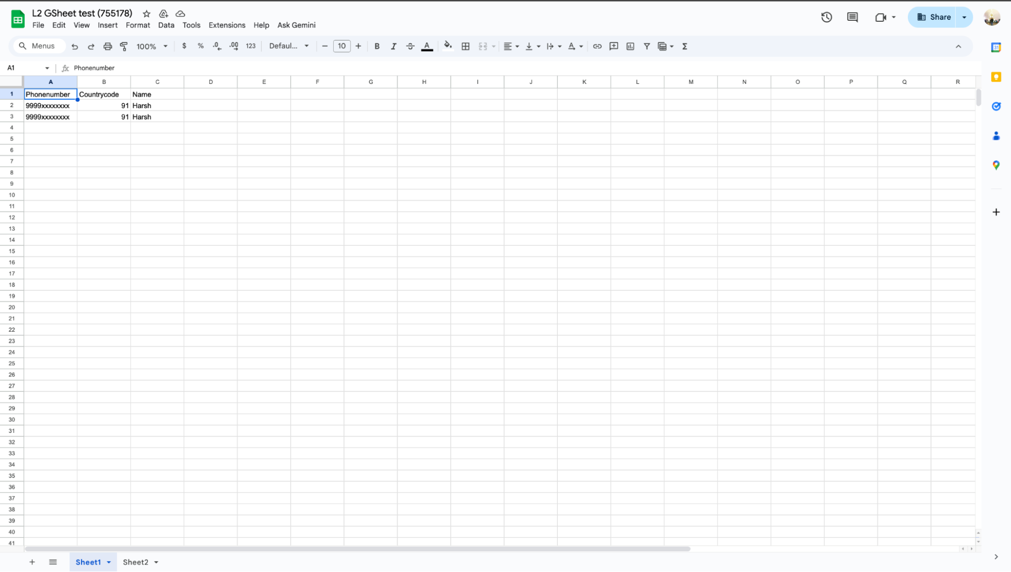 Open your Google Sheet and add a new row at the bottom with test information, including a valid phone number (preferably your own for testing purposes), country code, and any other required fields. Make sure the data follows the correct format, especially for phone numbers.