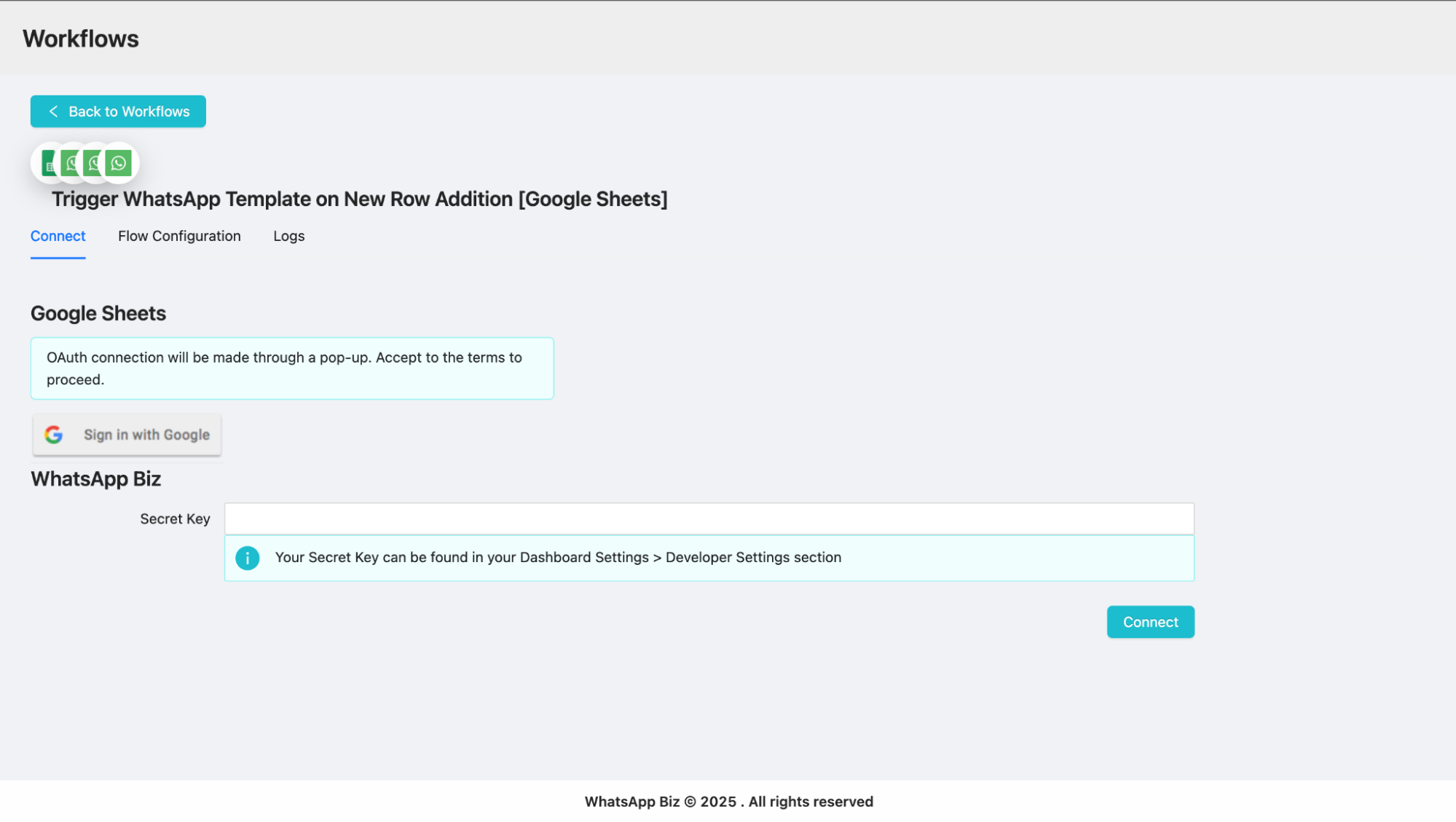 The authentication process for this workflow is identical to Workflow 1. You’ll need to authenticate both your Google account and your Interakt account.