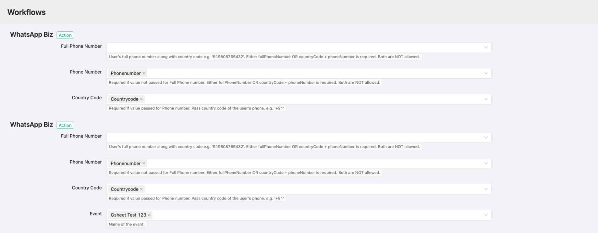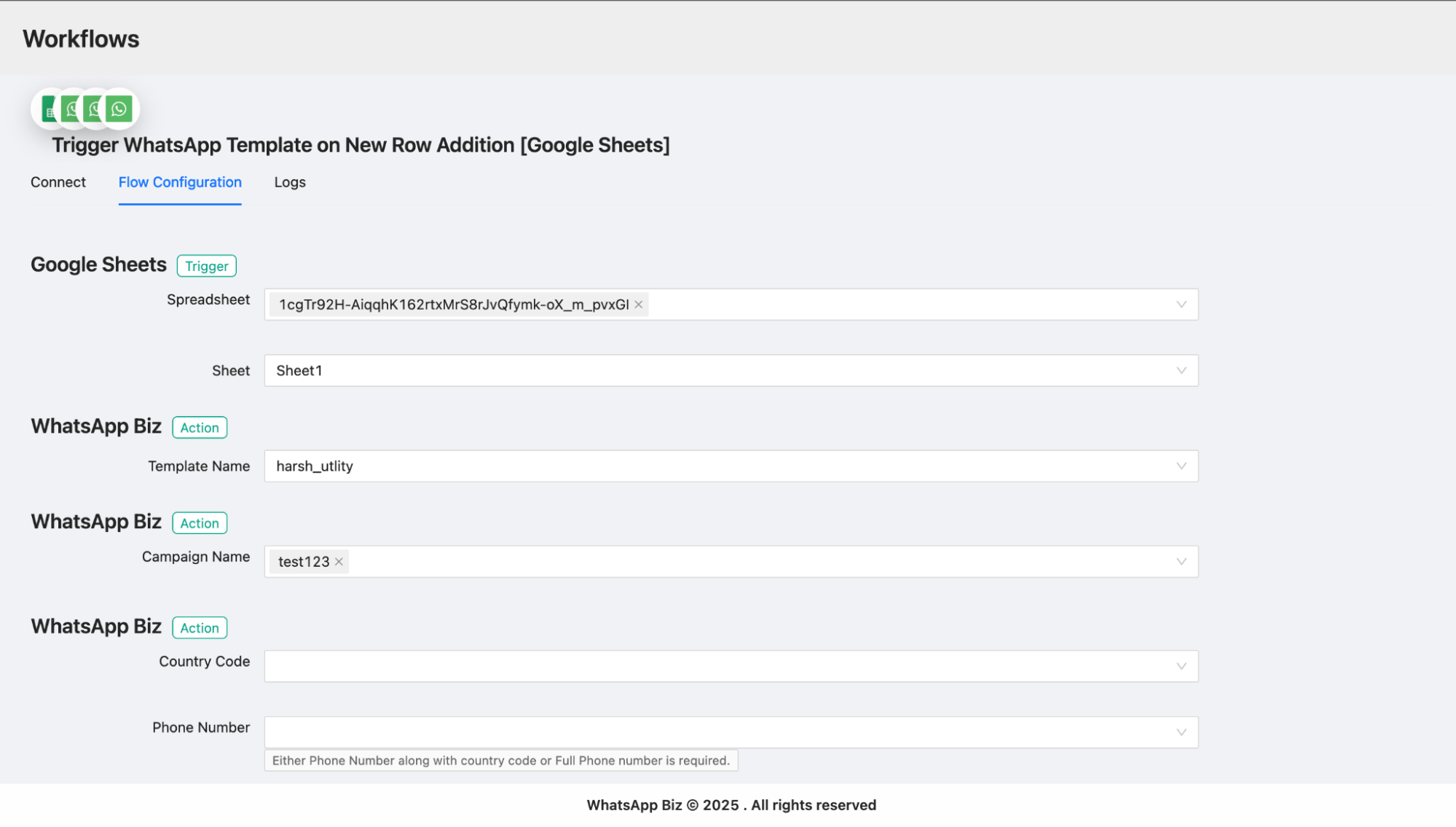 Important: The values you map here (Country Code, Phone Number, Name, etc.) must exactly match the column names in your connected Google Sheet. The integration will read data from these columns for each new row and insert the values into your WhatsApp message template.