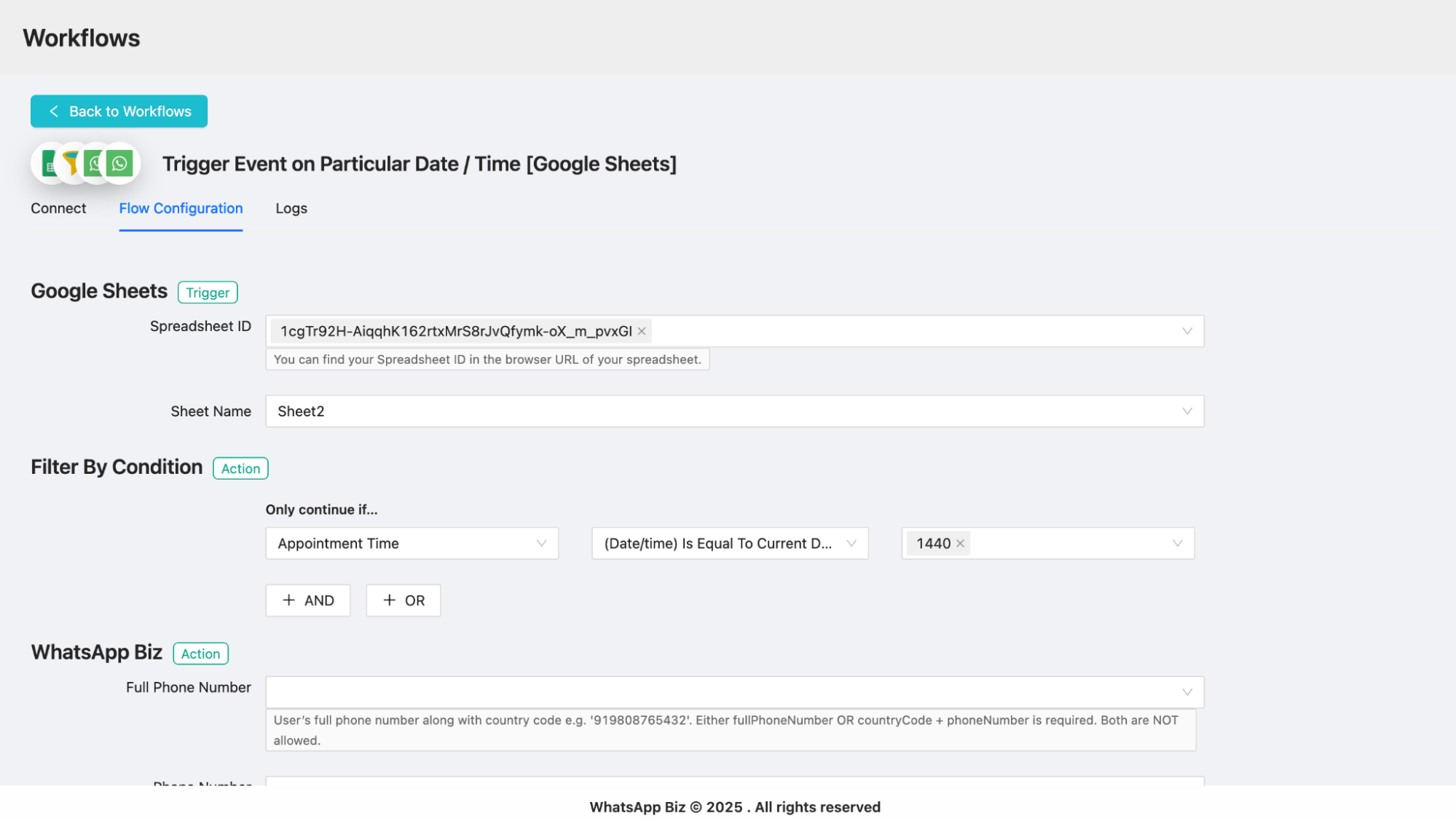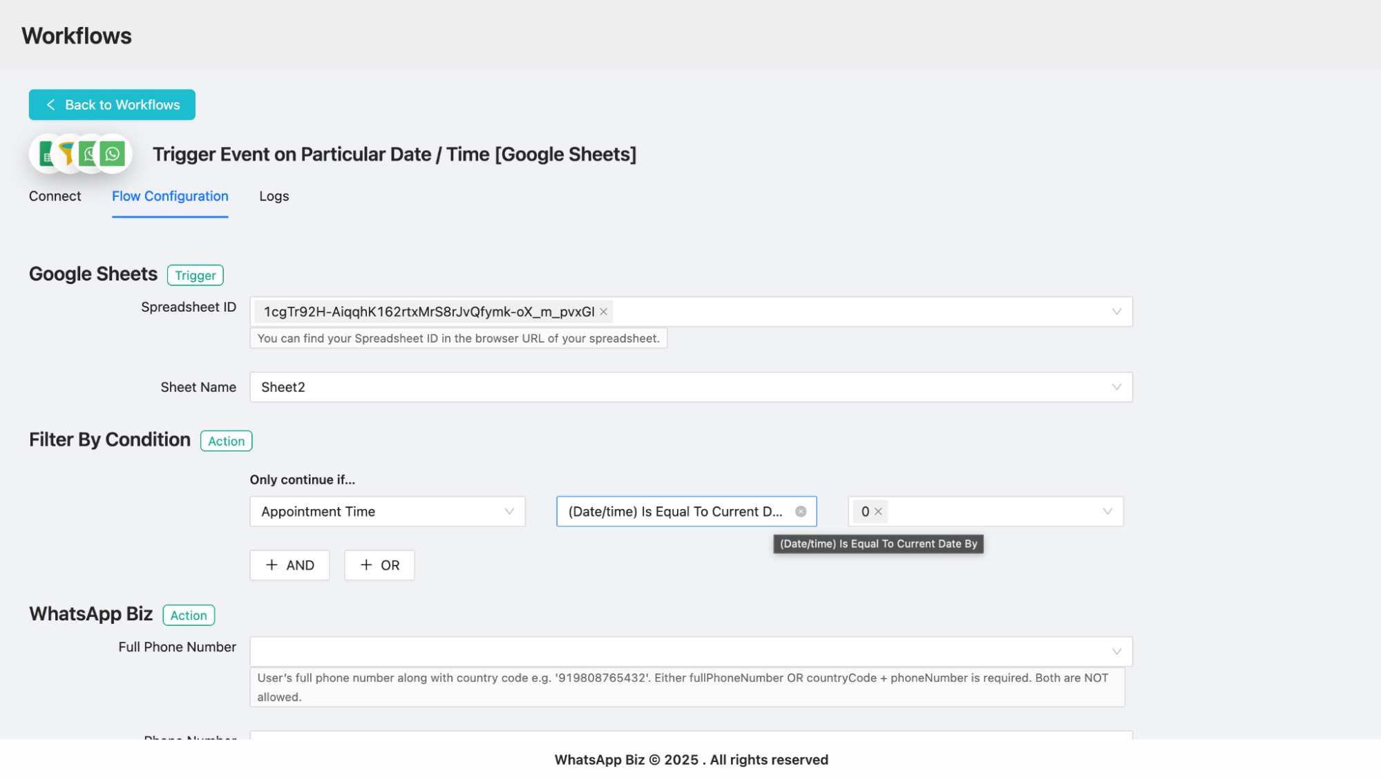 The second workflow enables you to send WhatsApp messages when specific date and time conditions are met in your Google Sheet. This is particularly powerful for appointment reminders, scheduled follow-ups, deadline notifications, and any time-based communication needs.