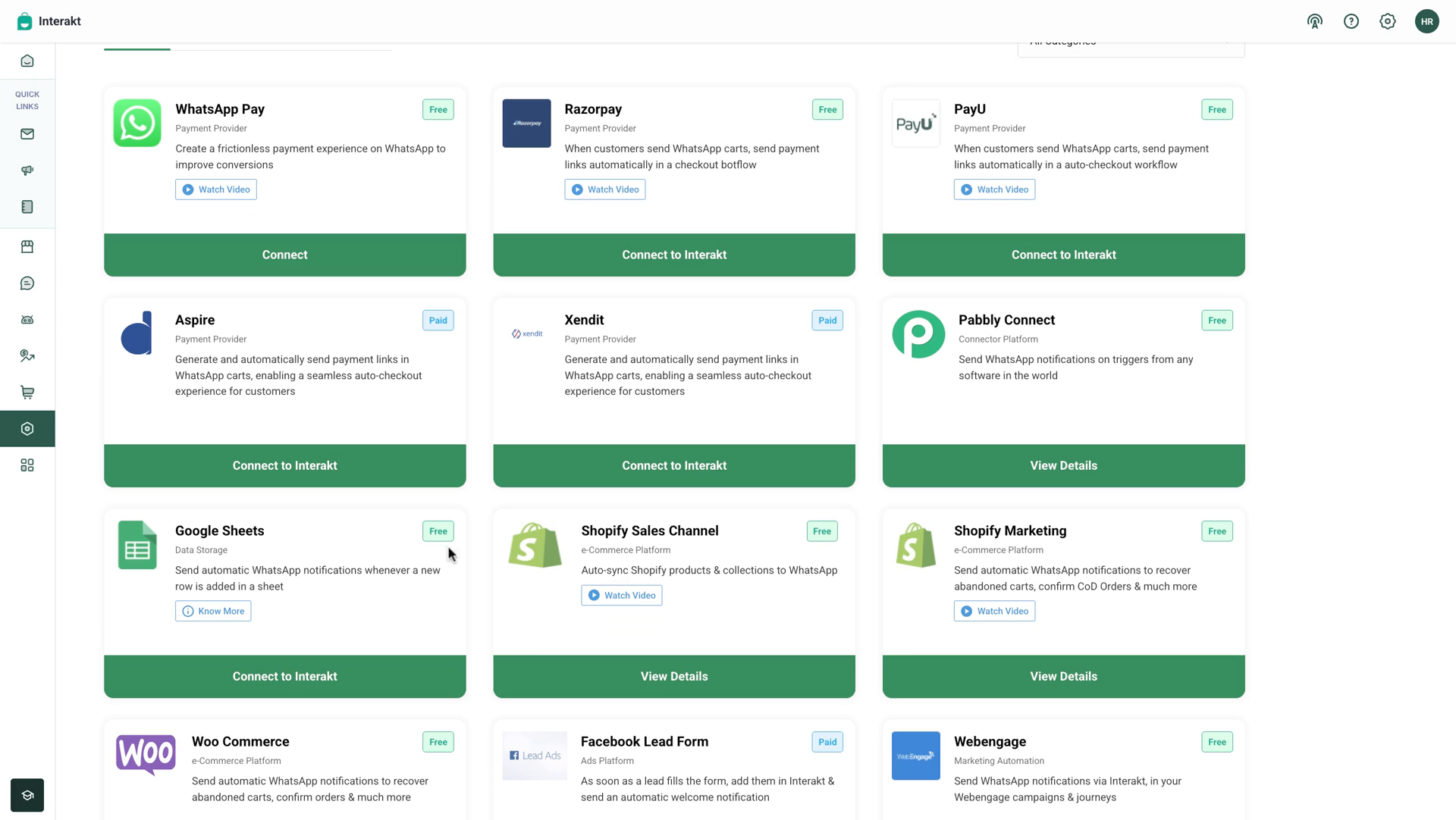 Log into your Interakt platform using your credentials. Once logged in, navigate to the Integrations section located on the left-hand sidebar menu. This section displays all available integration options that Interakt offers.