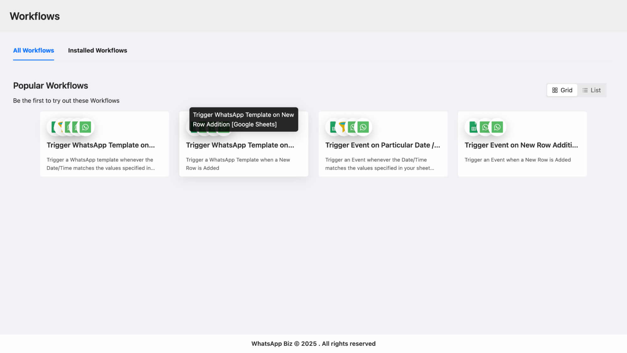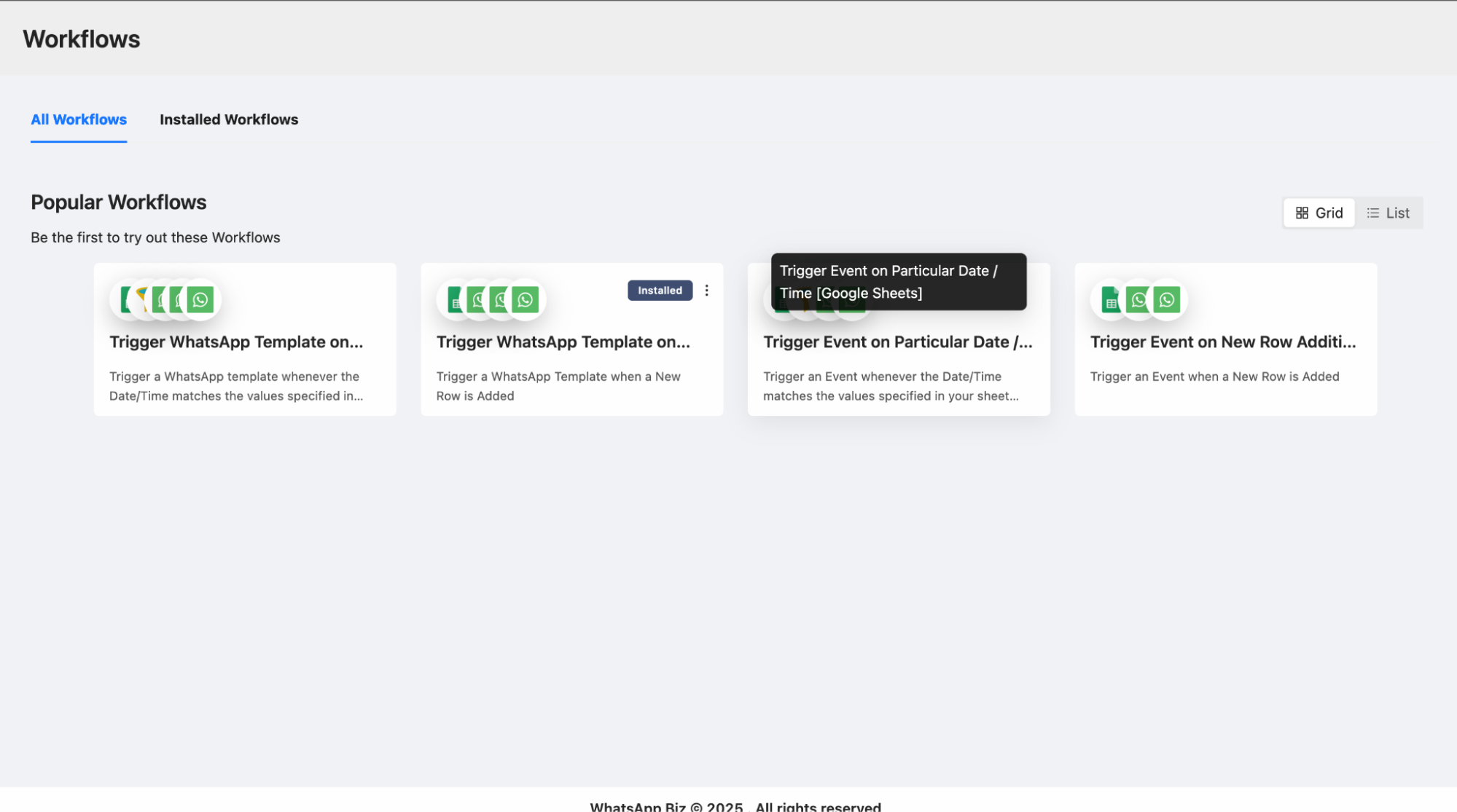 On the workflow selection screen, this time select the workflow titled “Send a WhatsApp Template on a particular Date” or “Trigger event on a particular date and time”. This workflow is specifically designed for time-based triggering rather than new row additions.