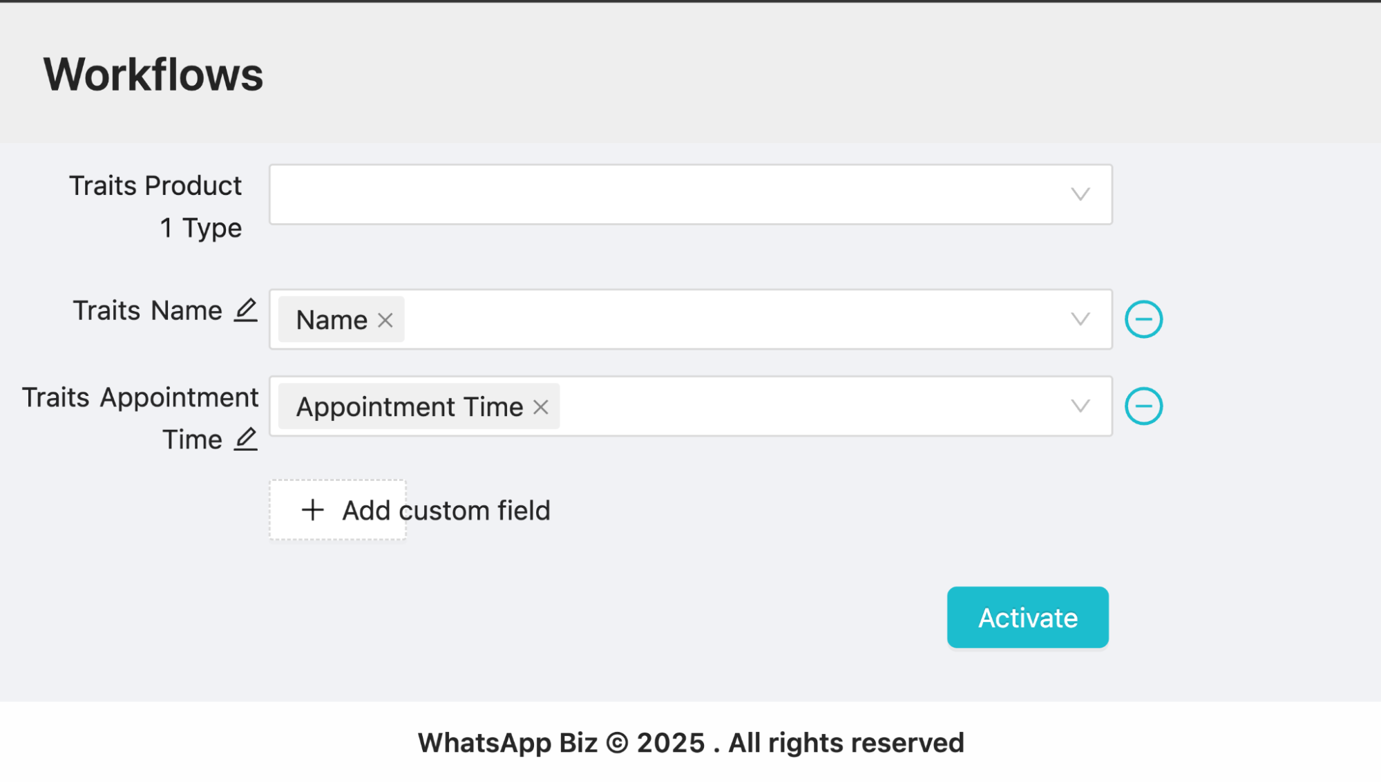 Next, add Custom Fields that you want to include in your WhatsApp message. Click Add Custom Field and select fields like: