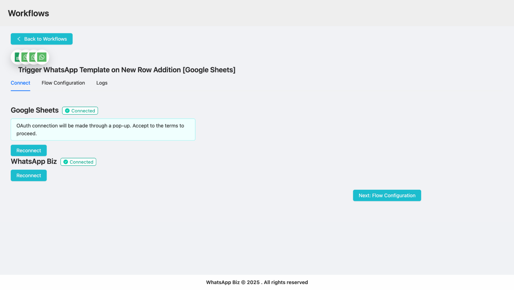 Upon successful authentication of both accounts, you’ll see confirmation indicators or checkmarks showing that both Google and Interakt are now connected. Click Next to proceed to the flow configuration section.
