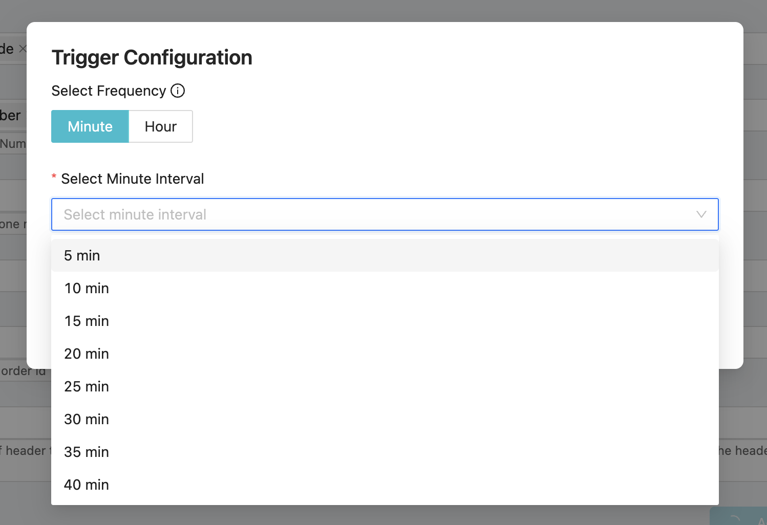 Click the Frequency or Interval setting. The system will present options for how often to check the sheet, with the minimum interval being 5 minutes. Select an appropriate interval based on your business needs: