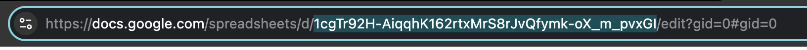 Spreadsheet ID – You’ll need to identify your Google Sheet’s unique ID, which is found in the spreadsheet URL. The ID is the alphanumeric string located between /d/ and /edit in the URL. For example, in the URL https://docs.google.com/spreadsheets/d/abc1234567/edit#gid=0, the spreadsheet ID is abc1234567.