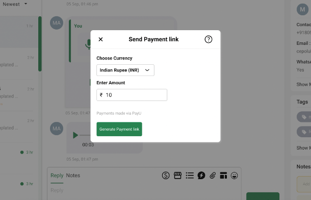 • Generate & Send Razorpay payment links to customers within seconds, while interacting via Interakt’s Shared Team WhatsApp Inbox